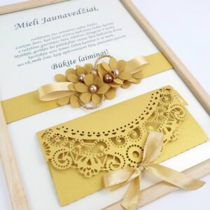 Produkto aprašymas Vestuvės – ypatinga šventė, todėl ir vestuvinis sveikinimas turėtų būti ypatingas. Rankų darbo sveikinimas rėmelyje su vokeliu pinigams